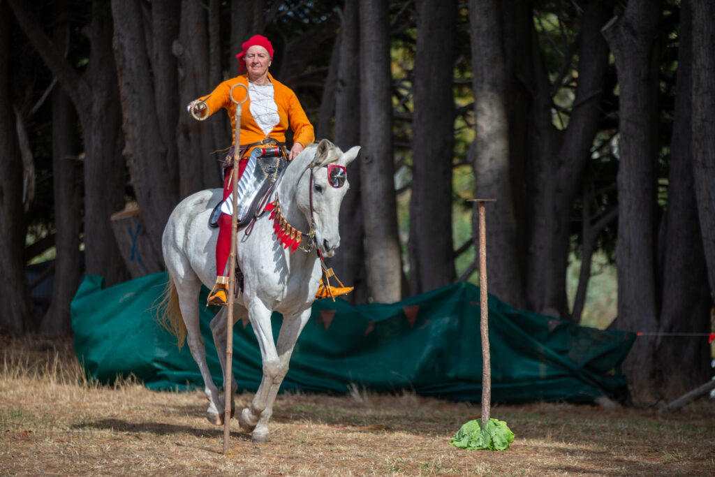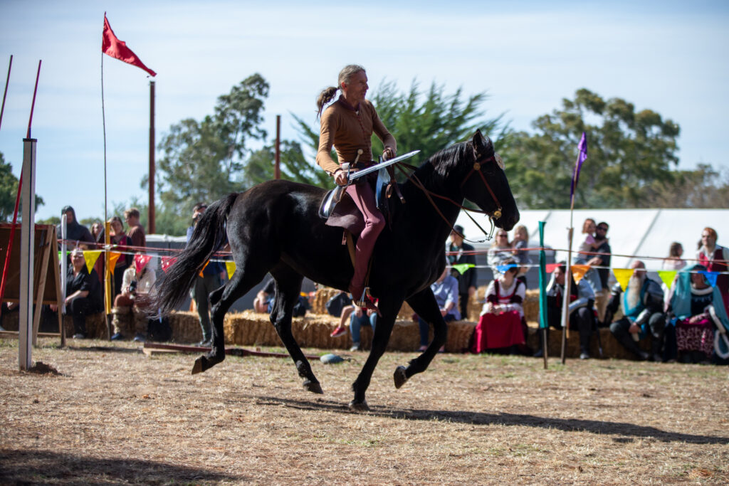 After spending several months preparing and making new gear, we enjoyed the new show and the horses did well. A melee is very different to a joust, requiring much more riding skills and horse education. Instead of riding a straight line for a single hit along a barrier for the joust, the melee requires turns and multiple approaches and departures. In full harness that really tests horses and riders. Additionally, fencing with clubs on moving horses can be a fun challenge. The goal is to get in range and try to smash the opponent’s crest, while at the same time protecting one’s own. So there is jockeying for position, trying to get in range, aiming blows, and tactical retreats.