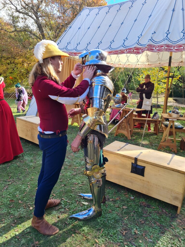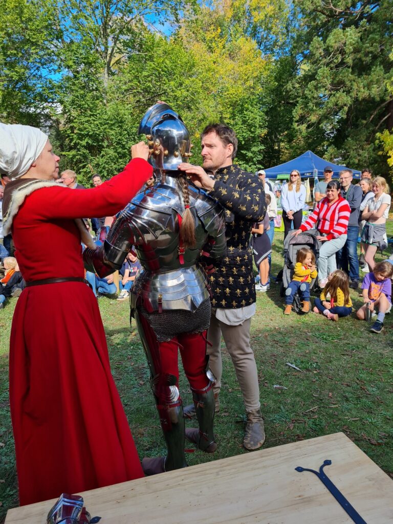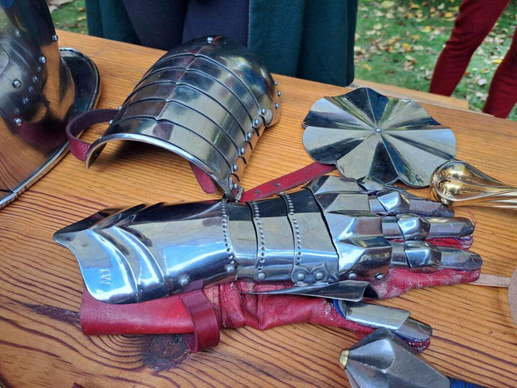 We are also happy to present the preparation of the horses, from grooming, to bridling and saddling, including their barding. Of course our saddles and other equipment are faithful replicas of historical items, and we can explain the differences to modern saddlery. Some examples of what we use can be found on our horse equipment page.