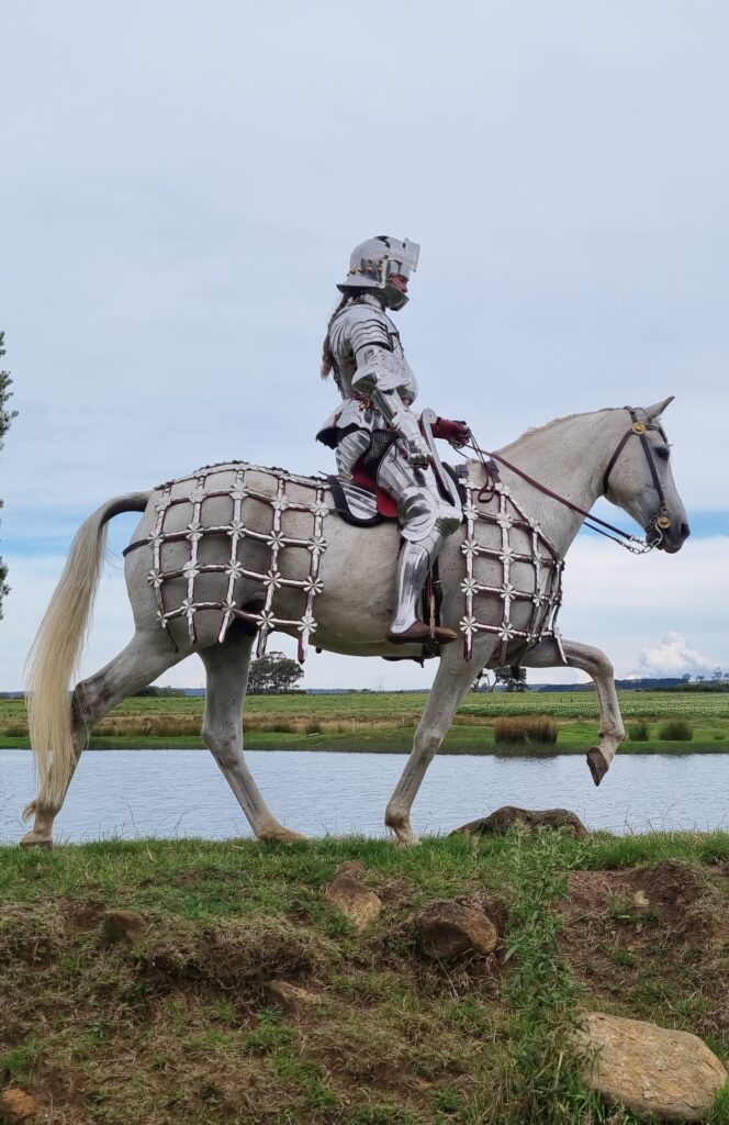 We use decorated leather barding as well as shamfrons, all of which are based on historical objects.