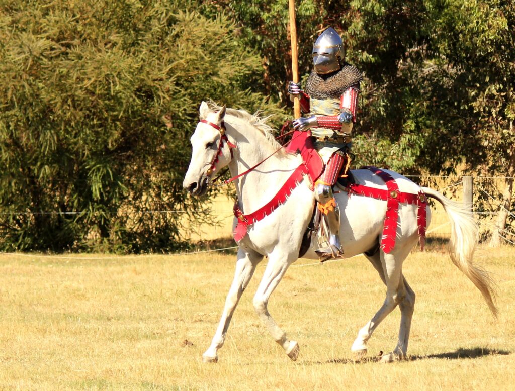 Phoebus’s saddle is a reconstruction of the war saddle from Bucharest in the Muzeul Militar National. The original was probably manufactured in a German speaking region towards the very end of the 15th C. This example is constructed with a solid timber tree and red leather. The saddle steels are modeled on the few that are preserved with the original saddle. Being fluted, heat treated, spring steel with pierced and gilt borders. Underneath are wool covered felt pads which provide no contact over the spine of the horse.
