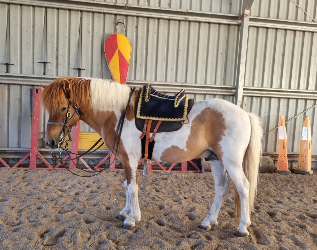 Sparky – a.k.a. Gneisti von Roetgen (Imp.GER) is an Icelandic stallion. Born in Germany, he first went to NZ, before landing in Australia. He is the sire of a bunch of nice riding horses. Between stud duties, he enjoys other challenges, which vary from beginner lesson horse to trail riding horse, horse archery mount, skill at arms horse, and of late jousting as well.
